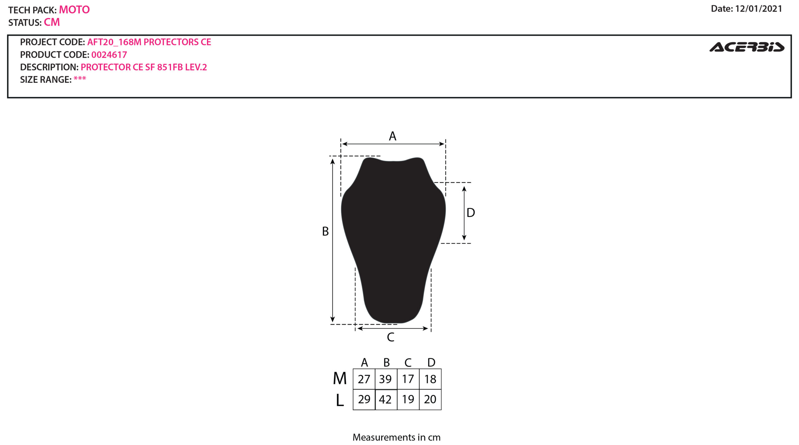 Ryggskyddet är CE-certifierat (EN 1621-2:2014 Level 2) och designat som en insats som placeras i kompatibla Acerbis jackor och tröjor. Modellen finns i olika storlekar som passar både dam- och herrmodeller beroende på storlek.