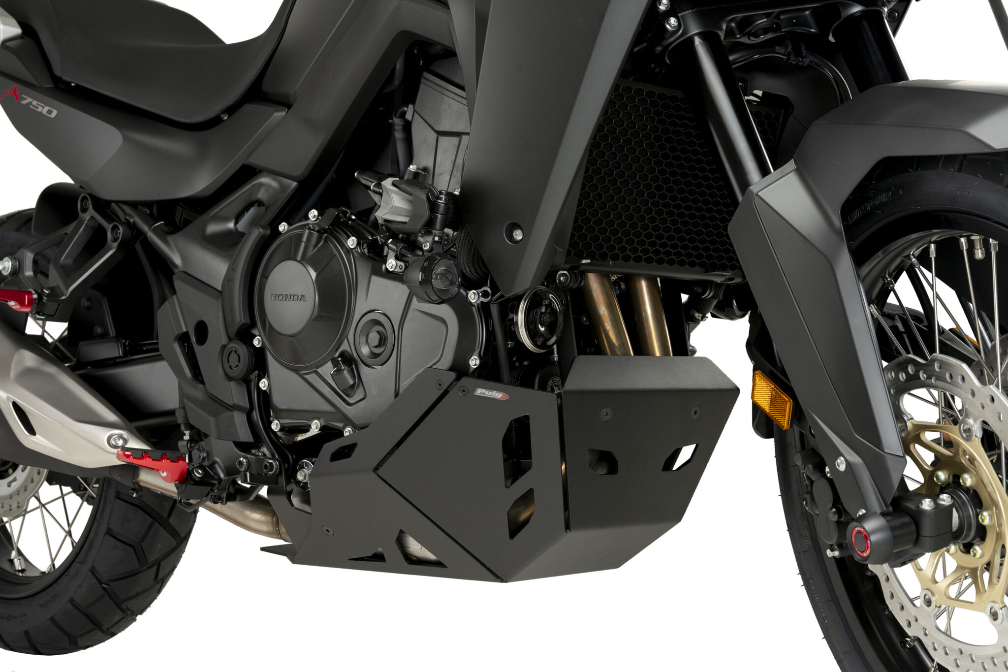 Bottneskyddets nedre del är helt platt, vilket gör det lättare att lyfta motorcykeln från botten i verkstaden om det behövs. Hålen säkerställer bra kylning och avlägsnande av vatten, lera eller små stenar samtidigt som det underlättar oljebyte genom att undvika att ta bort skyddet.