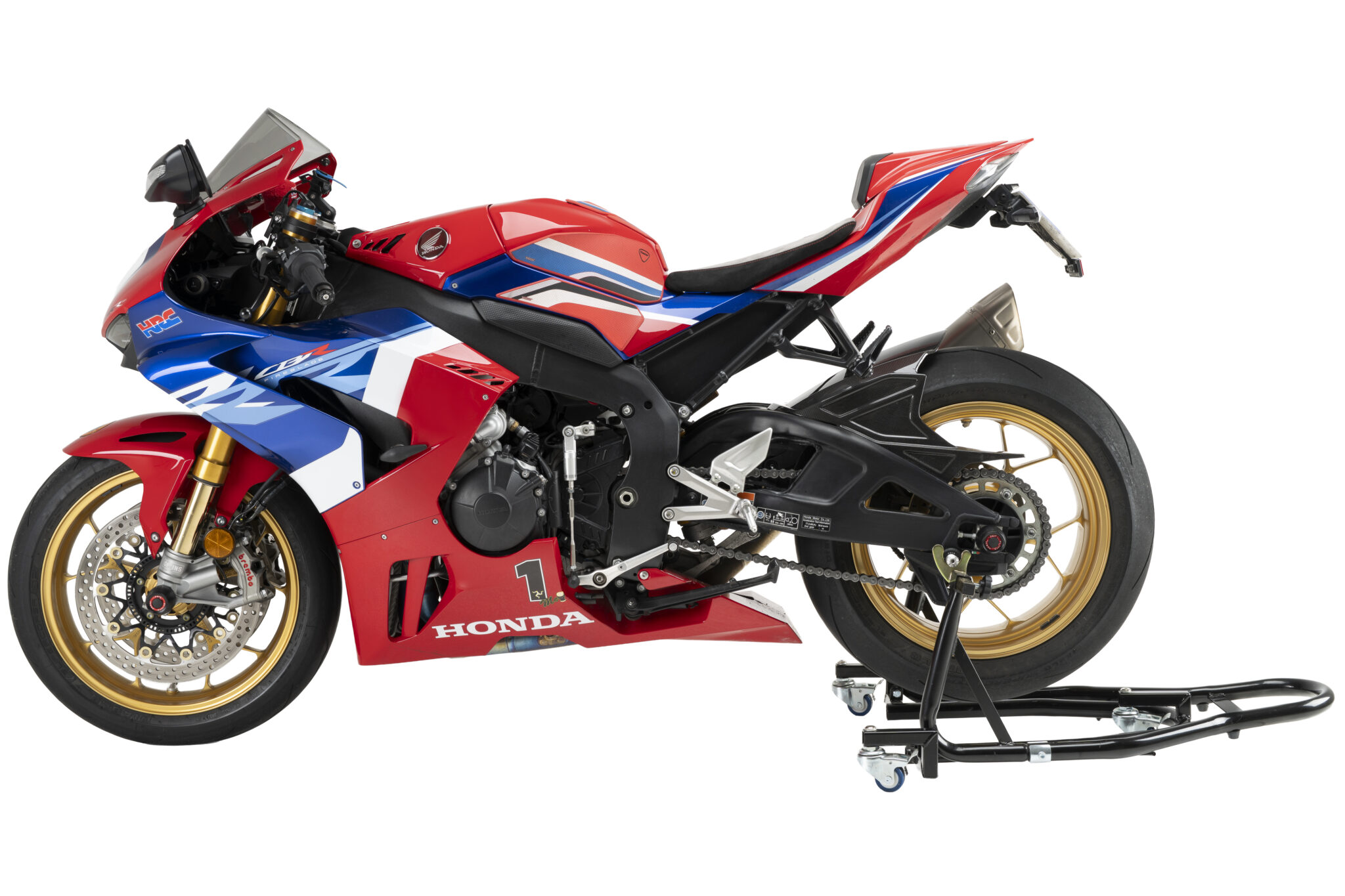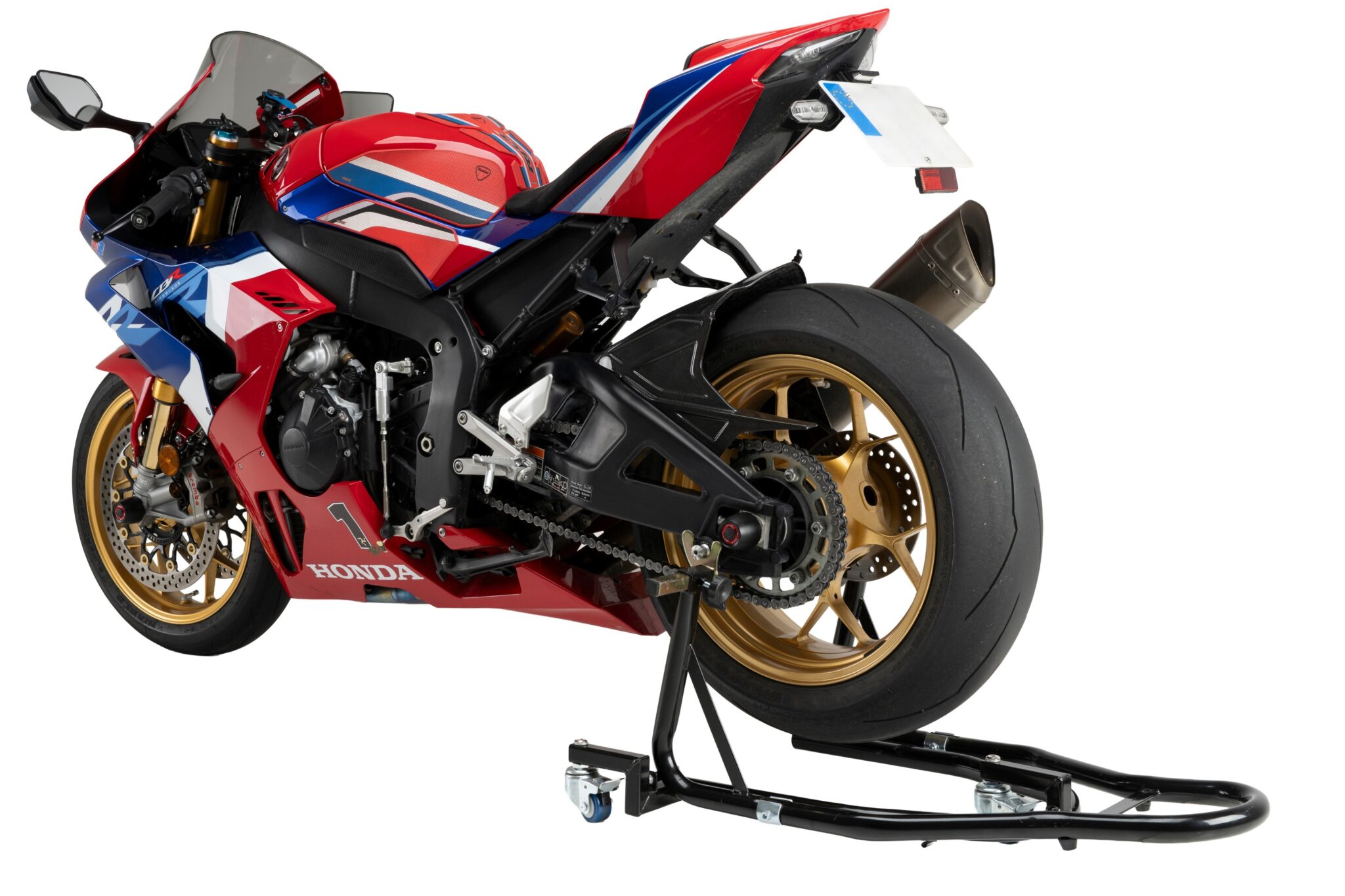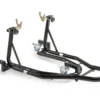 Stativet har låsbara hjul för fixering vid service och parkering. Höjden justeras från 19,5 till 34,5 cm och passar många motorcyklar.