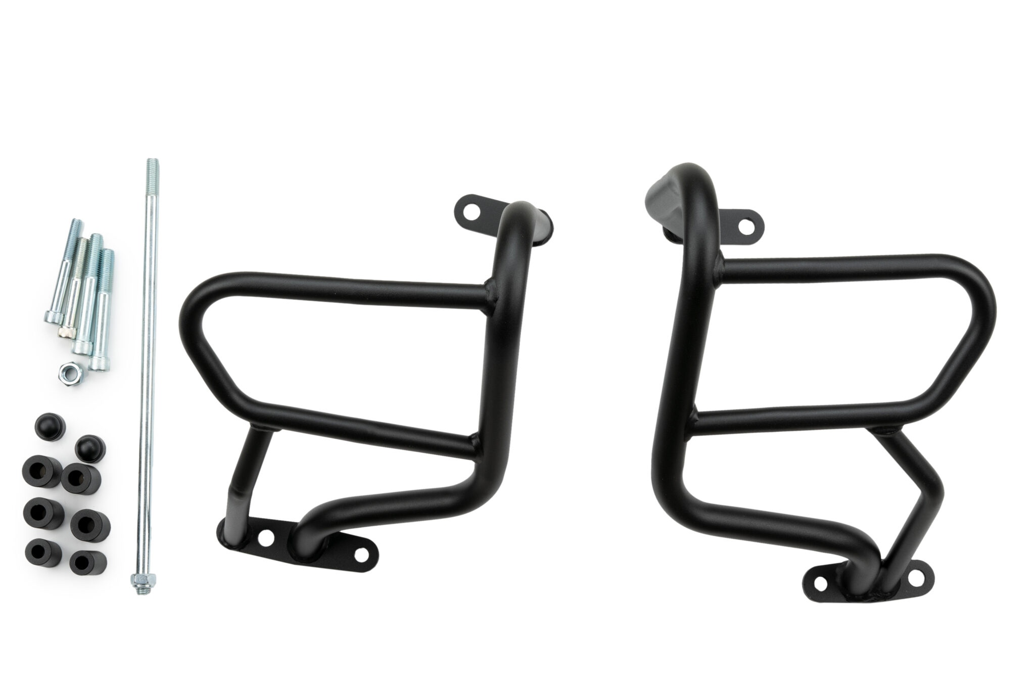 Motorbågen är tillverkad i robust stålrör med slitstark pulverlackerad yta för hög motståndskraft mot slag och korrosion. Den är modellspecifikt anpassad och monteras på motorcykelns befintliga fästpunkter med medföljande monteringsdelar för korrekt och säker installation.