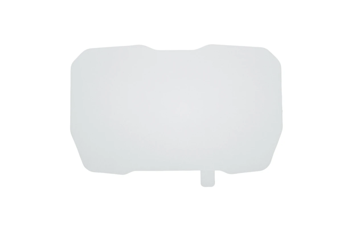 Skärmskyddet är tillverkat i klar, slagtålig plast och utformat för att följa instrumentpanelens konturer för korrekt passform. Materialet är konstruerat för att motstå mindre påverkan utan att påverka displayens synlighet eller funktion. Monteringen sker direkt på instrumentets yta utan behov av modifiering.
