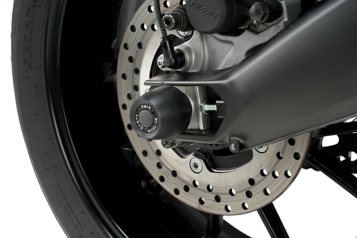 Puig bakhjulsskydd är utvecklat för att skydda svingarmen och bakhjulsaxeln mot skador vid vältning eller lättare omkullkörningar. Konstruktionen minskar direkt kontakt med underlaget och bidrar till att begränsa slitage och påverkan på viktiga komponenter.