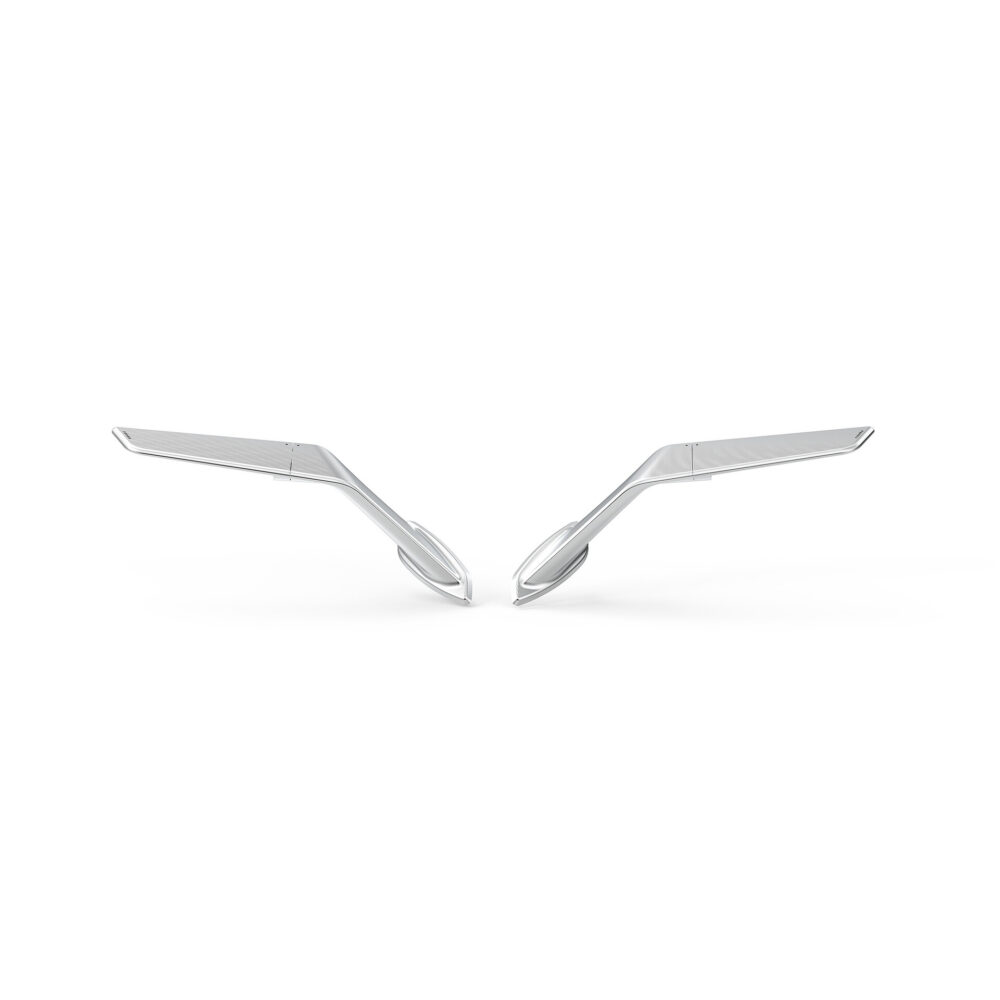 - Dubbel funktion: När spegeln är öppen fungerar den som en traditionell backspegel. När den fälls ner omvandlas den till en aerodynamisk vinge som genererar downforce vid höga hastigheter, vilket förbättrar motorcykelns stabilitet och grepp.