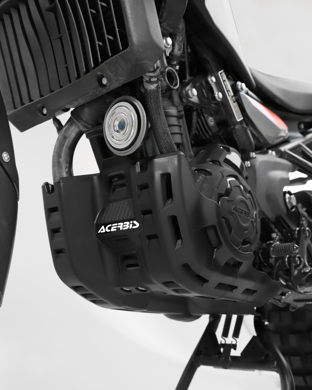 Bundskjoldet monteres nemt på motorcyklens originale beslag og er kompatibelt med Acerbis X-Power motorbeskyttelse.