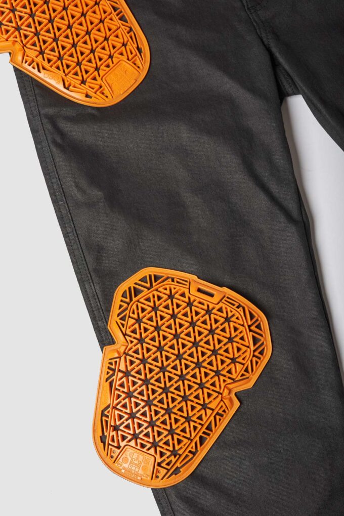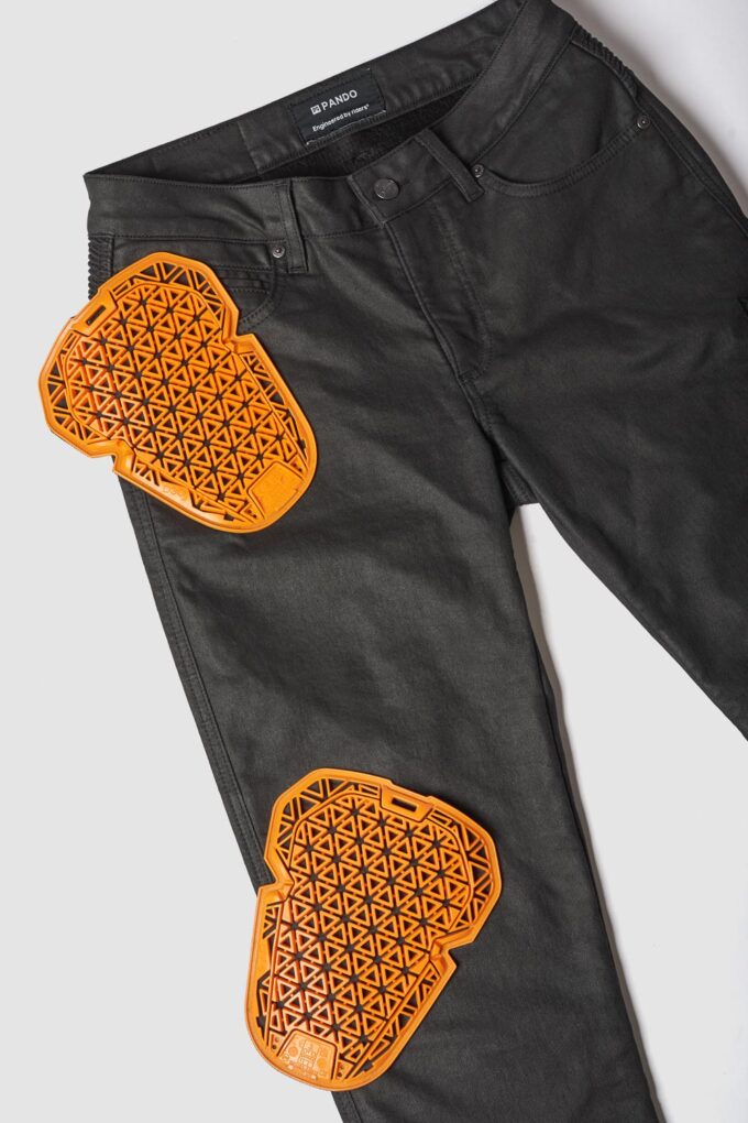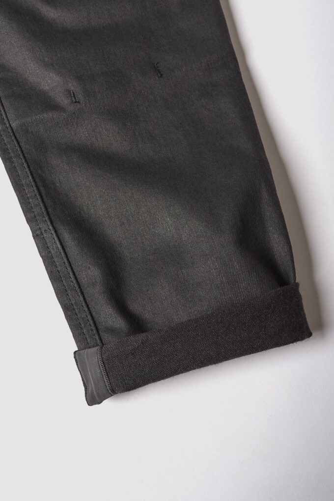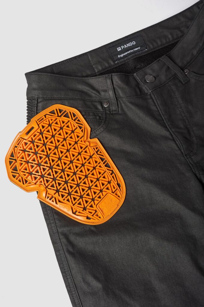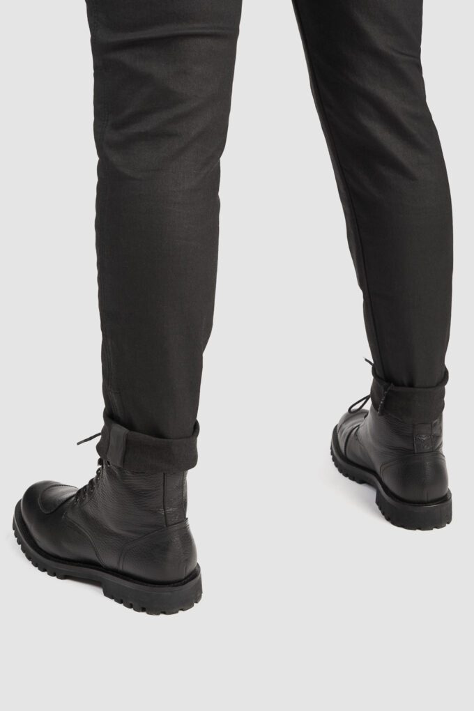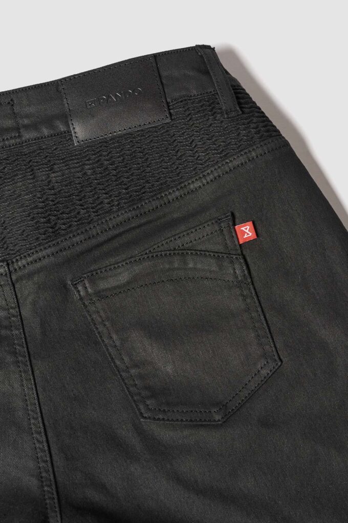 Pando Moto Lorica Black A er et par moderne, højtaljede motorcykeljeans i et voksbehandlet design, der kombinerer stil, komfort og sikkerhed. De ligner ved første øjekast et par læderbukser, men er faktisk fremstillet af fleksibelt, åndbart og slidstærkt CORDURA®-denim – ideelle til helårsbrug.