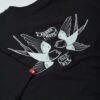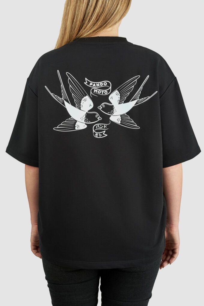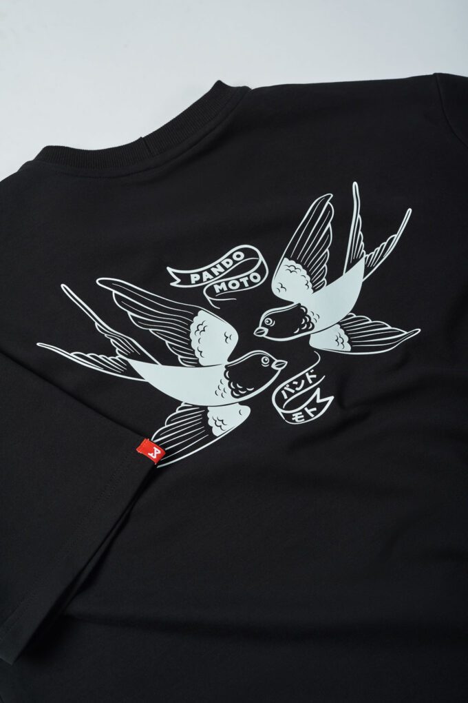- Stort grafisk motiv af to svaler på ryggen – et ikonisk Pando Moto-design, der symboliserer frihed og eventyr.
