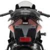 Den integrerede LED-nummerpladelygte sørger for korrekt belysning, og der medfølger beslag til montering af eftermarkedsblinklys (kræver adapter, hvis man ønsker OEM-blinklys). Ophænget reducerer både vægt og volumen sammenlignet med OEM-holderen og giver motorcyklens bagende et mere minimalistisk udtryk.